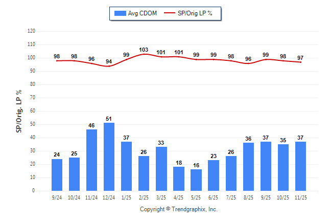 November 2025 Average Continuous Days on Market trend was Rising and Sold/Original List Price Ratio Remains Steady**