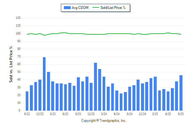 September 2025 Average Continuous Days on Market trend was Rising and Sold/List Price Ratio Remains Steady**