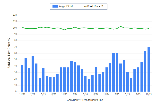 November 2025 Average Continuous Days on Market trend was Rising and Sold/List Price Ratio Remains Steady**