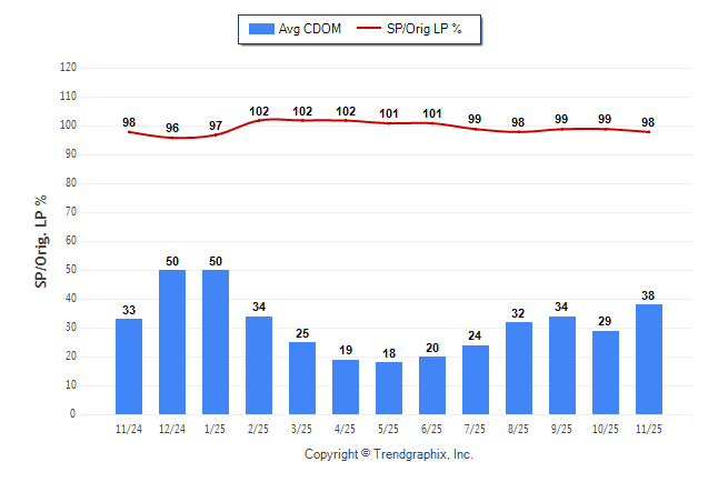 November 2025 Average Continuous Days on Market trend was Rising and Sold/Original List Price Ratio Remains Steady**