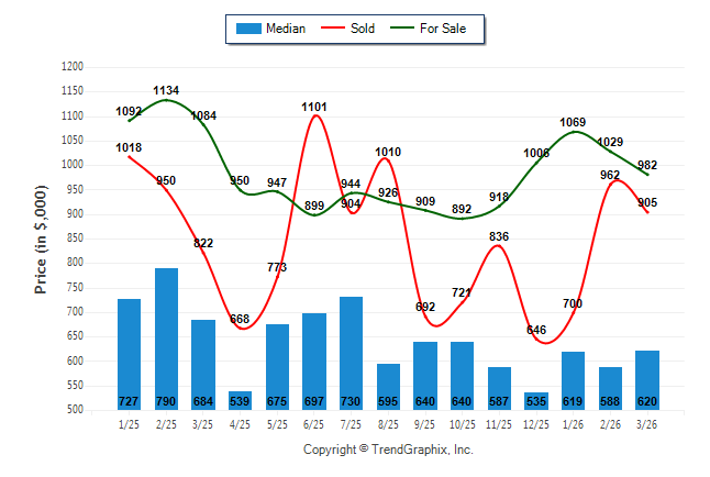 March 2026 Median Price was Appreciating, Avg. For Sale Price was Neutral, and Avg. Sold Price was Neutral**