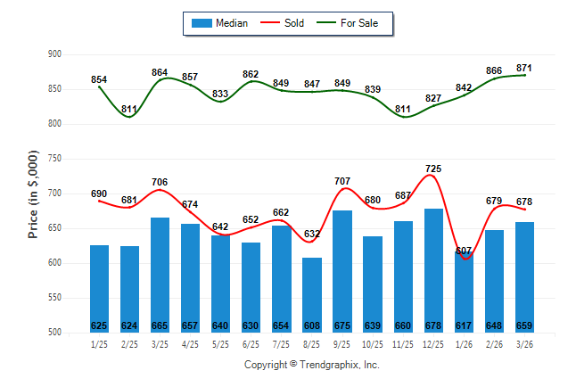 March 2026 Median Price was Neutral, Avg. For Sale Price was Appreciating, and Avg. Sold Price was Neutral**
