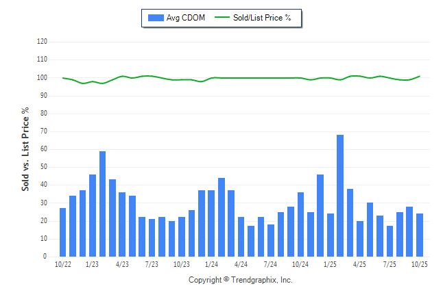 October 2025 Average Continuous Days on Market trend Remains Steady and Sold/List Price Ratio Remains Steady**