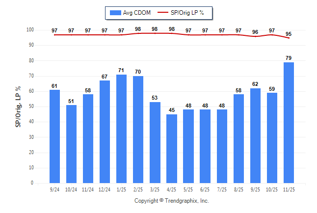November 2025 Average Continuous Days on Market trend was Rising and Sold/Original List Price Ratio was Falling**