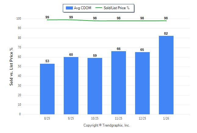 January 2026 Average Continuous Days on Market trend was Rising and Sold/List Price Ratio was Falling**