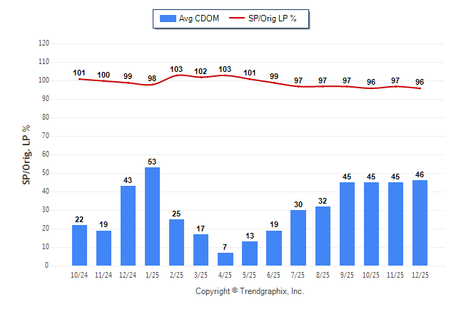 December 2025 Average Continuous Days on Market trend was Rising and Sold/Original List Price Ratio was Falling**