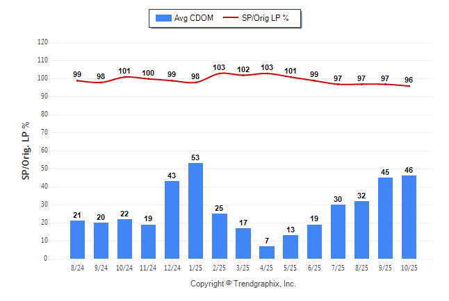 October 2025 Average Continuous Days on Market trend was Rising and Sold/Original List Price Ratio was Falling**