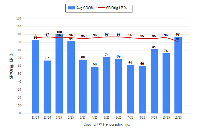 November 2025 Average Continuous Days on Market trend was Rising and Sold/Original List Price Ratio was Falling**