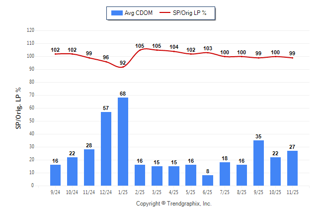 November 2025 Average Continuous Days on Market trend Remains Steady and Sold/Original List Price Ratio was Falling**