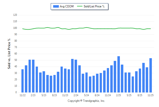 November 2025 Average Continuous Days on Market trend was Rising and Sold/List Price Ratio Remains Steady**