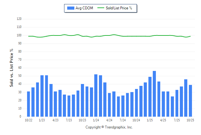 October 2025 Average Continuous Days on Market trend Remains Steady and Sold/List Price Ratio Remains Steady**