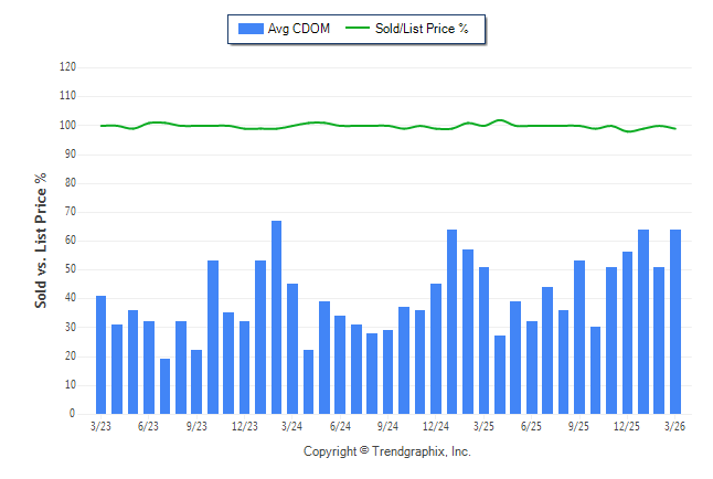 March 2026 Average Continuous Days on Market trend was Rising and Sold/List Price Ratio Remains Steady**