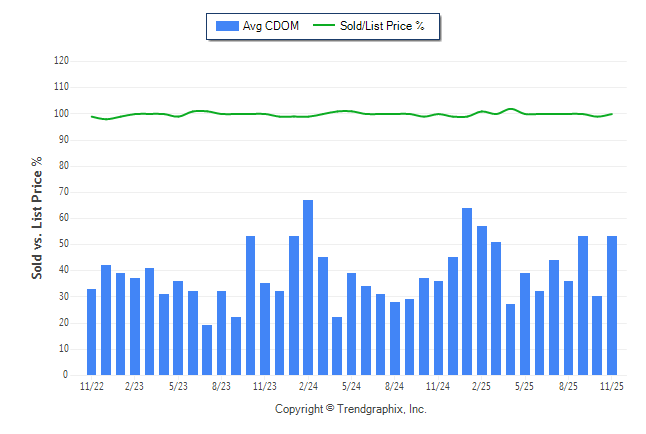 November 2025 Average Continuous Days on Market trend was Rising and Sold/List Price Ratio Remains Steady**