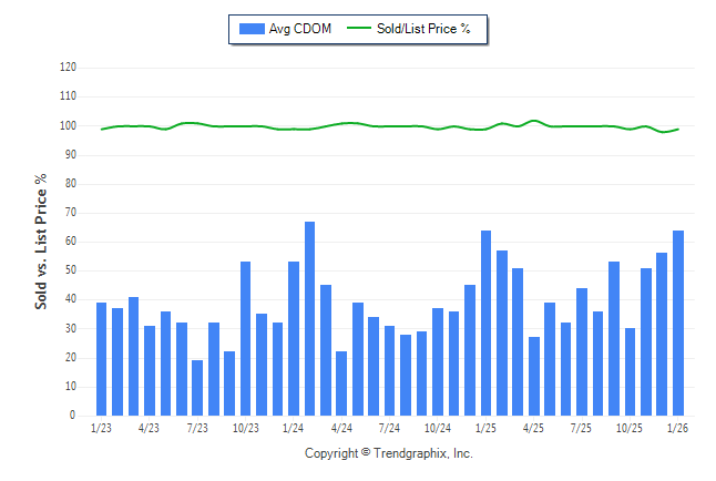 January 2026 Average Continuous Days on Market trend was Rising and Sold/List Price Ratio Remains Steady**