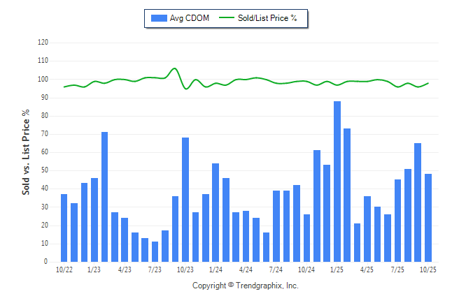 October 2025 Average Continuous Days on Market trend Remains Steady and Sold/List Price Ratio Remains Steady**