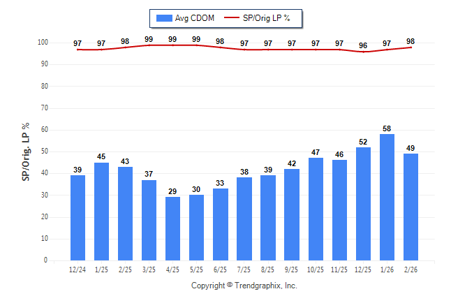 February 2026 Average Continuous Days on Market trend Remains Steady and Sold/Original List Price Ratio Remains Steady**