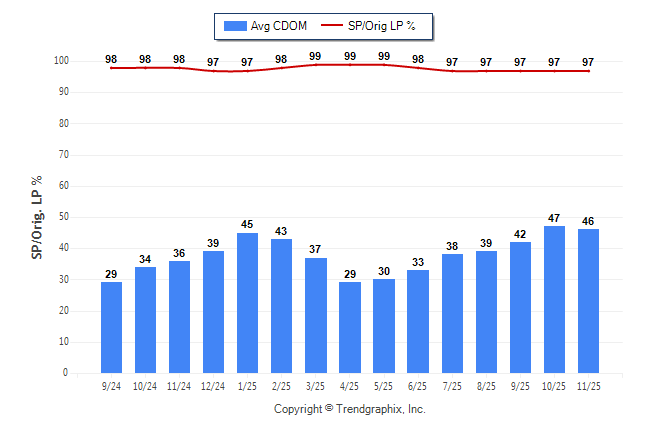 November 2025 Average Continuous Days on Market trend Remains Steady and Sold/Original List Price Ratio Remains Steady**