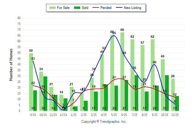Curnt vs. Same Month 1 Yr Ago: For Sale up33.3% | New Listing down-33.3% | Sold down-7.1% | Pended up9.1%