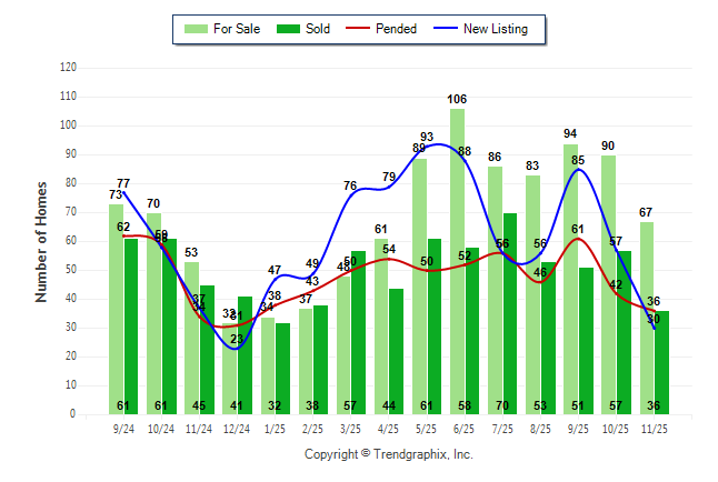 Curnt vs. Prev Month: For Sale down-25.6% | New Listing down-47.4% | Sold down-36.8% | Pended down-14.3%