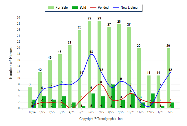 Curnt vs. Same Month 1 Yr Ago: For Sale up25% | New Listing up71.4% | Sold down-33.3% | Pended 0%