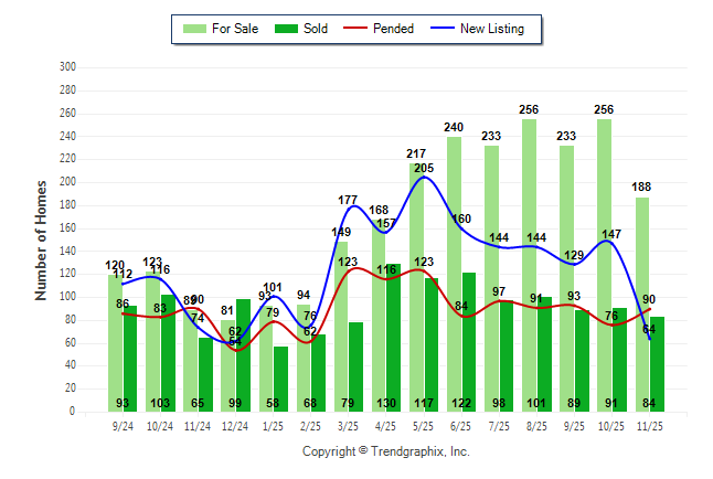 Curnt vs. Prev Month: For Sale down-26.6% | New Listing down-56.5% | Sold down-7.7% | Pended up18.4%