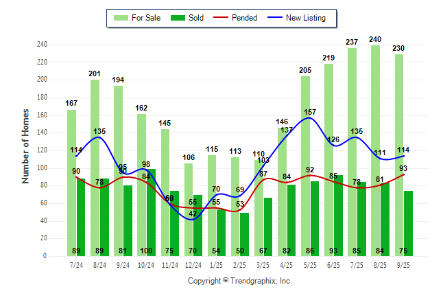 Curnt vs. Same Month 1 Yr Ago: For Sale up18.6% | New Listing up20% | Sold down-7.4% | Pended up3.3%