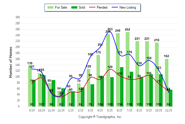 Curnt vs. Prev Month: For Sale down-25% | New Listing down-60.2% | Sold down-47.3% | Pended down-33.3%