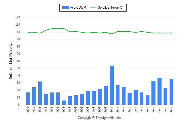 November 2025 Average Continuous Days on Market trend Remains Steady and Sold/List Price Ratio was Falling**
