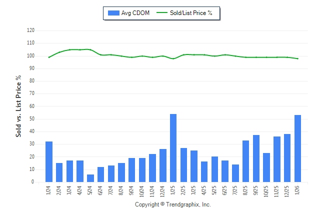 January 2026 Average Continuous Days on Market trend was Rising and Sold/List Price Ratio Remains Steady**
