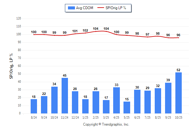 October 2025 Average Continuous Days on Market trend was Rising and Sold/Original List Price Ratio was Falling**