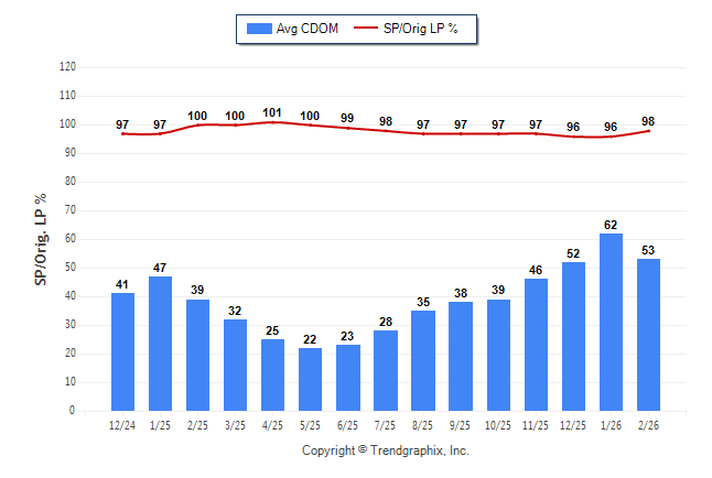 February 2026 Average Continuous Days on Market trend Remains Steady and Sold/Original List Price Ratio Remains Steady**
