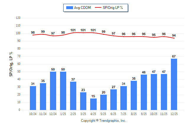 December 2025 Average Continuous Days on Market trend was Rising and Sold/Original List Price Ratio was Falling**
