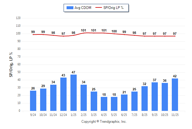 November 2025 Average Continuous Days on Market trend was Rising and Sold/Original List Price Ratio was Falling**