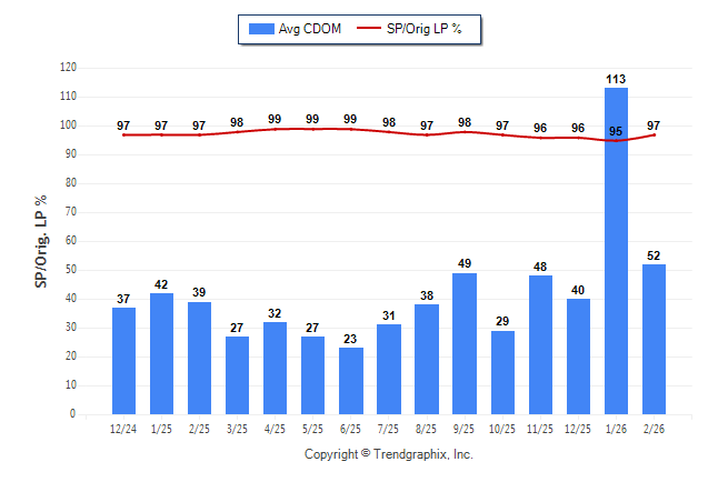 February 2026 Average Continuous Days on Market trend Remains Steady and Sold/Original List Price Ratio Remains Steady**