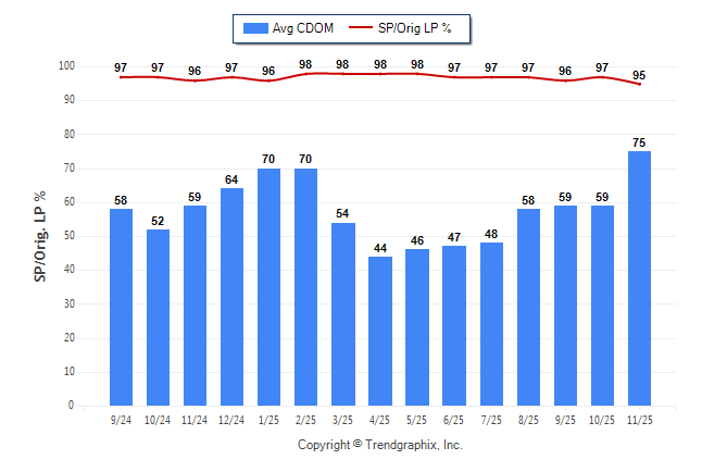 November 2025 Average Continuous Days on Market trend was Rising and Sold/Original List Price Ratio was Falling**
