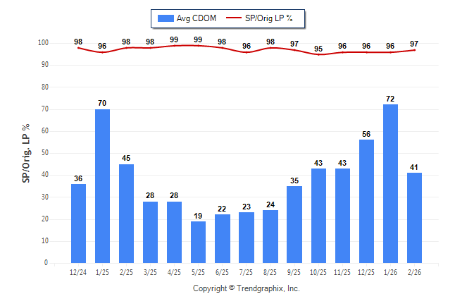 February 2026 Average Continuous Days on Market trend Remains Steady and Sold/Original List Price Ratio Remains Steady**