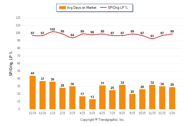 January 2026 Average Days on Market trend Remains Steady and Sold/Original List Price Ratio Remains Steady**
