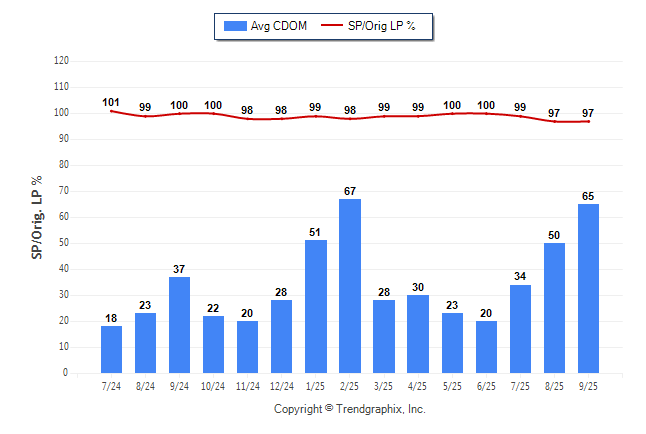 September 2025 Average Continuous Days on Market trend was Rising and Sold/Original List Price Ratio was Falling**