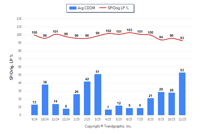 November 2025 Average Continuous Days on Market trend was Rising and Sold/Original List Price Ratio was Falling**