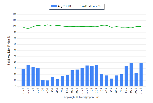 November 2025 Average Continuous Days on Market trend was Rising and Sold/List Price Ratio Remains Steady**