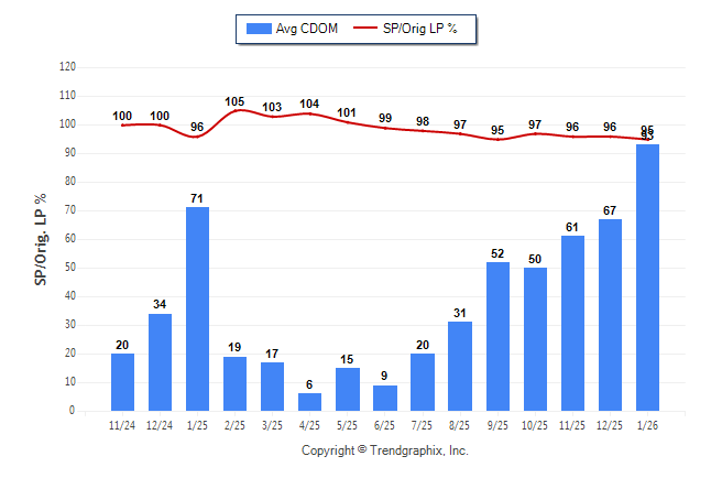 January 2026 Average Continuous Days on Market trend was Rising and Sold/Original List Price Ratio Remains Steady**