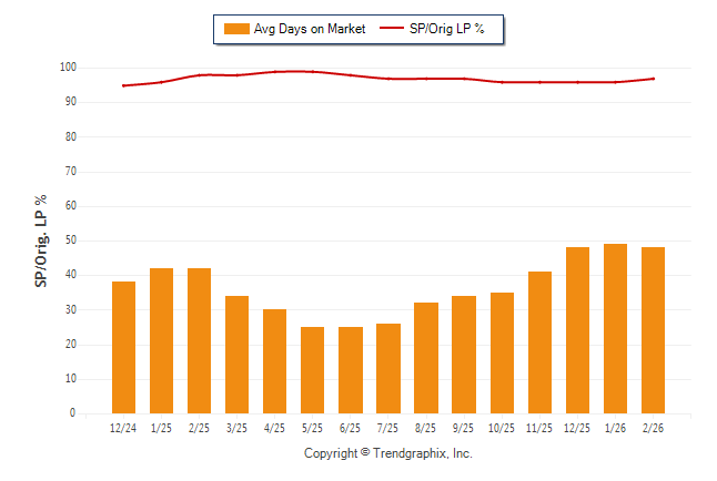 February 2026 Average Days on Market trend Remains Steady and Sold/Original List Price Ratio Remains Steady**