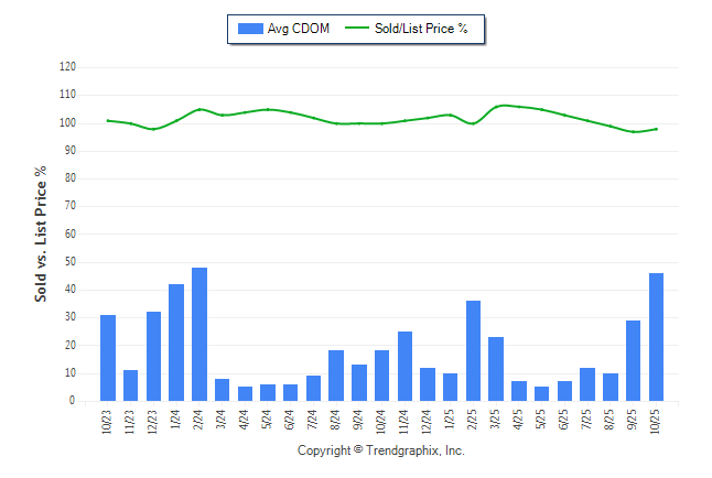 October 2025 Average Continuous Days on Market trend was Rising and Sold/List Price Ratio Remains Steady**