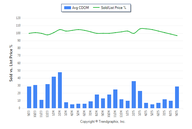 September 2025 Average Continuous Days on Market trend was Rising and Sold/List Price Ratio was Falling**