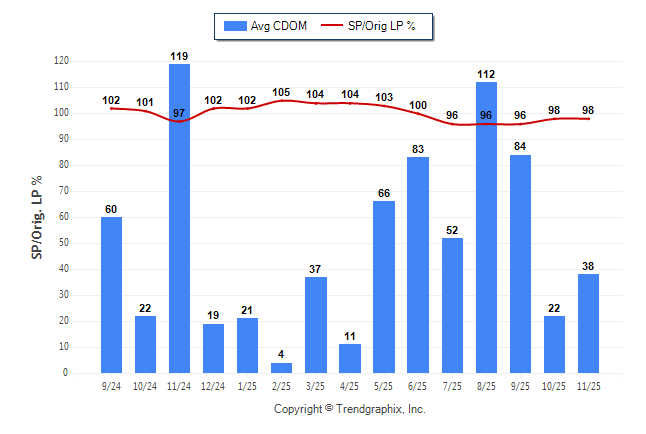 November 2025 Average Continuous Days on Market trend Remains Steady and Sold/Original List Price Ratio Remains Steady**