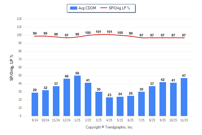 November 2025 Average Continuous Days on Market trend was Rising and Sold/Original List Price Ratio was Falling**