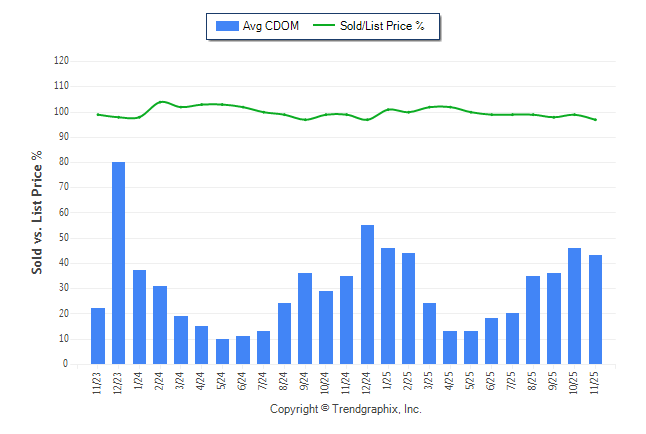 November 2025 Average Continuous Days on Market trend Remains Steady and Sold/List Price Ratio was Falling**