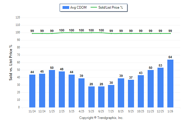 January 2026 Average Continuous Days on Market trend was Rising and Sold/List Price Ratio Remains Steady**