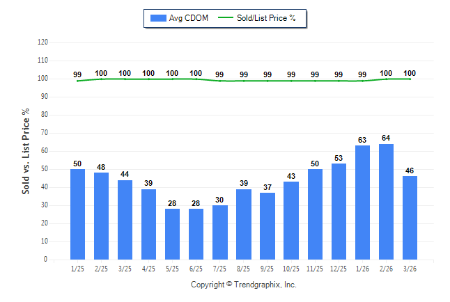 March 2026 Average Continuous Days on Market trend Remains Steady and Sold/List Price Ratio was Rising**