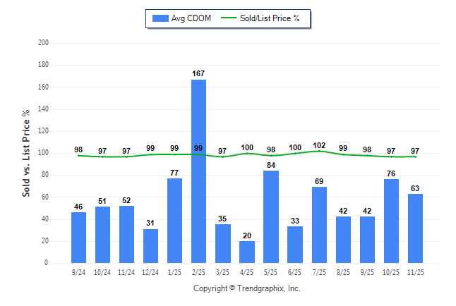 November 2025 Average Continuous Days on Market trend Remains Steady and Sold/List Price Ratio was Falling**